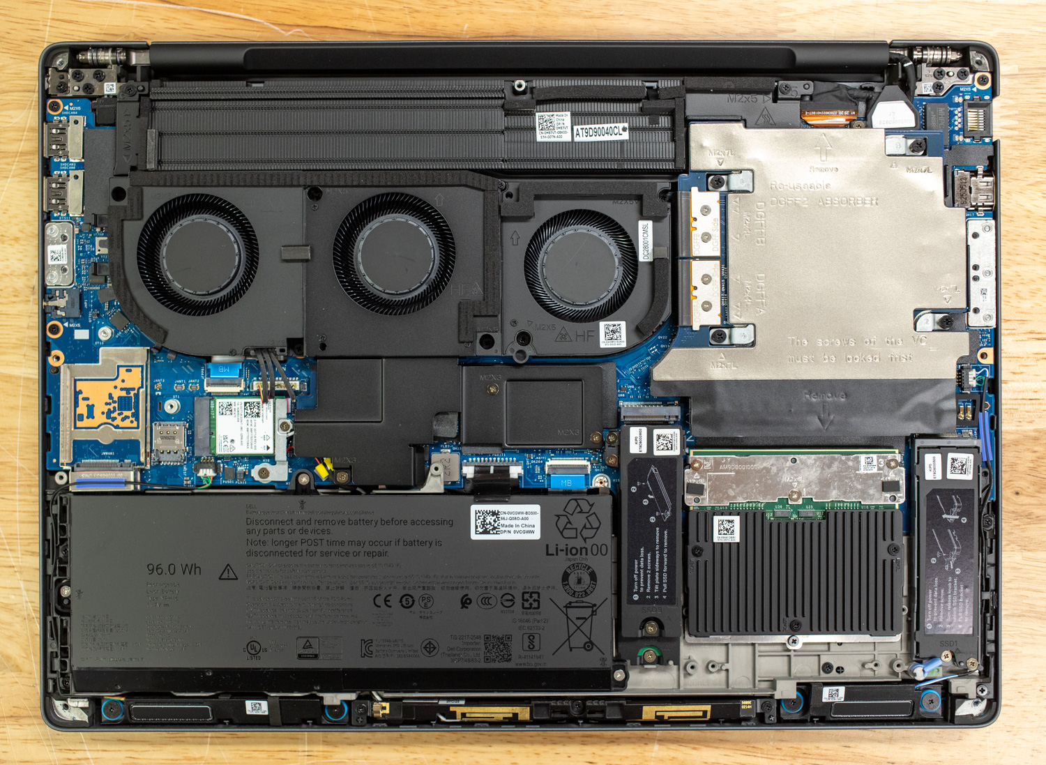 Buồng hơi (Vapor Chamber) toàn phần: Trên các cấu hình cao cấp, Dell bỏ hẳn các ống đồng (heat pipes) truyền thống và dùng hệ thống buồng hơi lớn che phủ cả CPU và GPU. Nước bên trong buồng hơi hóa thực hiện chu trình bay hơi - ngưng tụ liên tục, giúp tản nhiệt nhanh hơn ống đồng gấp nhiều lần.