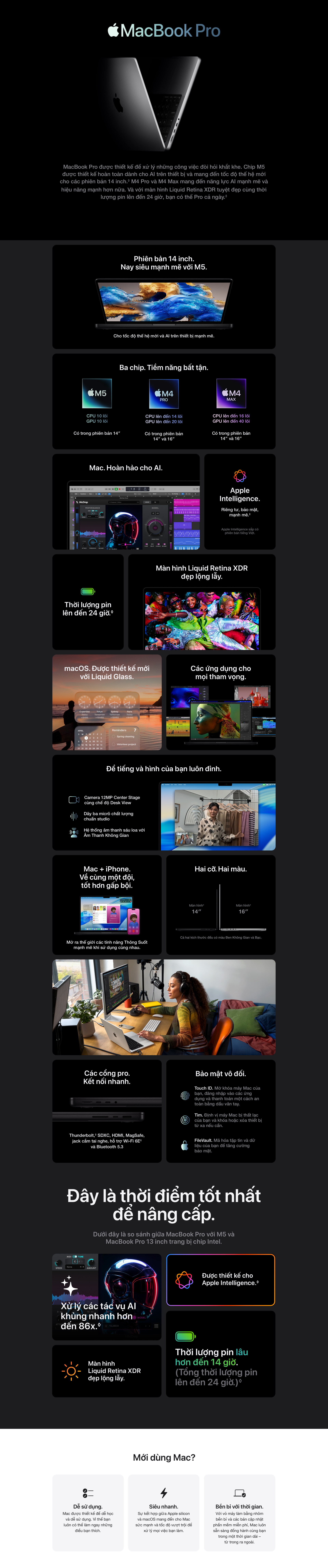 | Màn Hình | 14.2 inch Liquid Retina XDR, Tỷ lệ tương phản 1.000.000:1, Độ sáng XDR 1.000 nit toàn màn hình, tối đa 1.600 nit (HDR), SDR 1.000 nit (ngoài trời), 1 tỷ màu, Dải màu rộng (P3), Công nghệ True Tone, Công nghệ ProMotion, Nano-texture (với bản nano) |