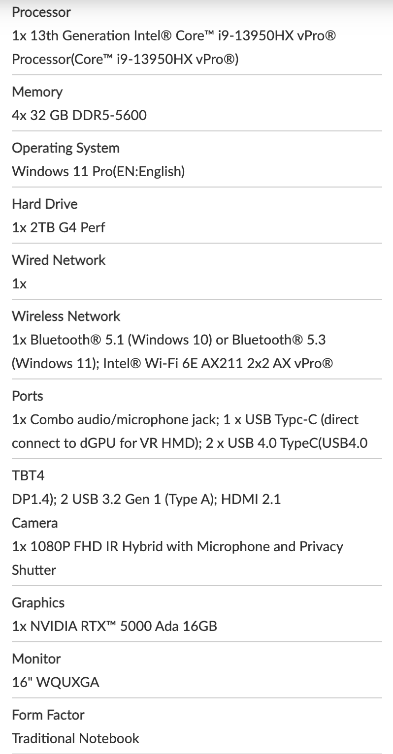 - CPU:13th Gen Intel® Core™ i9-13950HX 5.5 GHz, Boost up to 5.5 GHz, 24 Cores / 32 Threads, 36MB of Cache