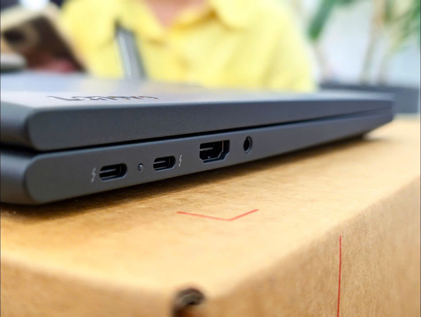 Điểm ăn tiền lớn nhất của ThinkPad T14s 2-in-1 chính là bản lề 360 độ chắc chắn. Bạn có thể sử dụng máy ở 4 chế độ: Laptop truyền thống, Tablet (máy tính bảng), Tent (chữ V) và Stand (trình chiếu). Khung máy vẫn được làm từ hợp kim nhôm và magie kết hợp sợi carbon, đảm bảo đạt chuẩn độ bền quân đội MIL-STD-810H. Đặc biệt, dải cổng kết nối vô cùng hào phóng với 2x Thunderbolt 4, 2x USB-A, 1x HDMI 2.1 – một điều hiếm thấy trên các laptop xoay gập mỏng nhẹ hiện nay.